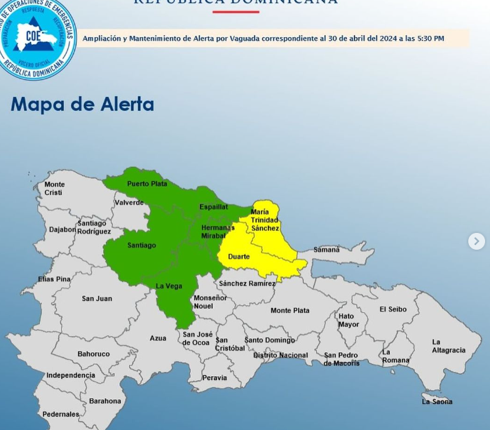 Santo Domingo RD–El Centro de Operaciones de Emergencia (COE), informo que mantiene 02 provincias en alerta amarilla y aumenta 05 en verde, debido a que el patrón meteorológico seguirá bajo la incidencia de los efectos locales (calentamiento diurno y orográfico) y la aproximación de una vaguada en la porción oriental de Cuba.