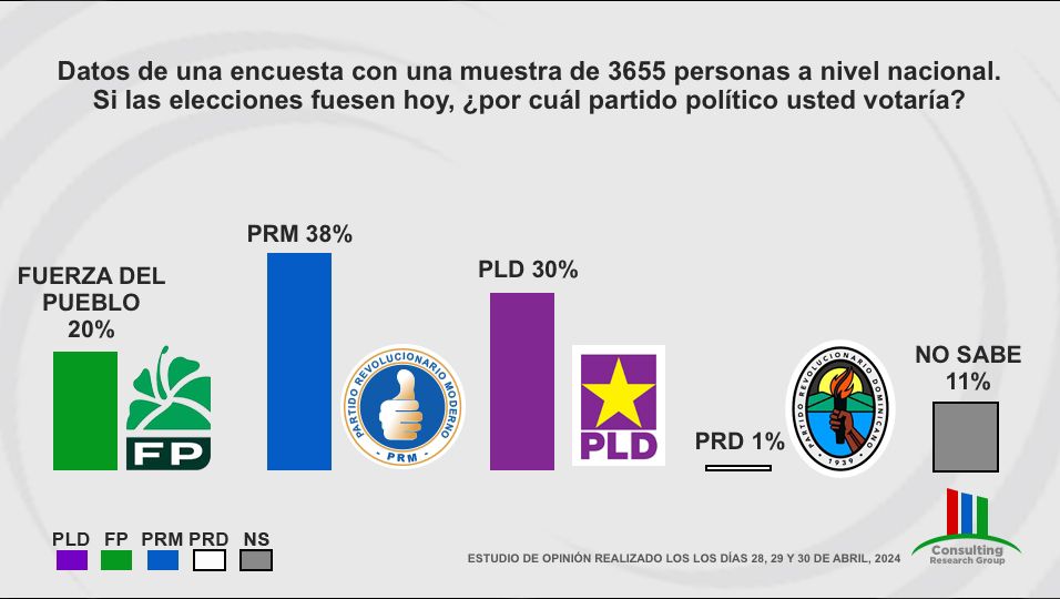 Santo Domingo, República Dominicana. Un estudio realizado por la firma encuestadora Consulting Research Group, en el que se midió la intención del voto en torno a las candidaturas presidenciales de los principales partidos políticos, refleja un seguro escenario de segunda vuelta electoral de cara a las próximas elecciones presidenciales del 19 de mayo, en donde, según los resultados, el balotaje sería entre el Partido Revolucionario Moderno (PRM) y el Partido de la Liberación Dominicana (PLD)