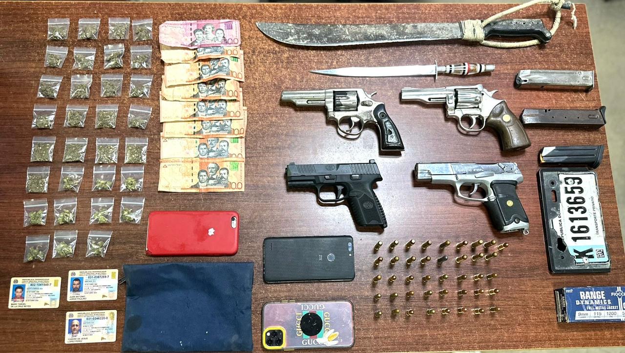 En las intervenciones se incautaron dos revólveres, uno marca Dan Wesson, calibre 38, serie No. 878888 y otro del mismo calibre, marca no legible, así como también dos pistolas, una marca FN Columbia, serie No. GKS0198610, otra marca Ruger P89, serie no visible, ambas calibre 9mm, todas con sus cargadores y varias cápsulas, desprovistas de documentación legal.