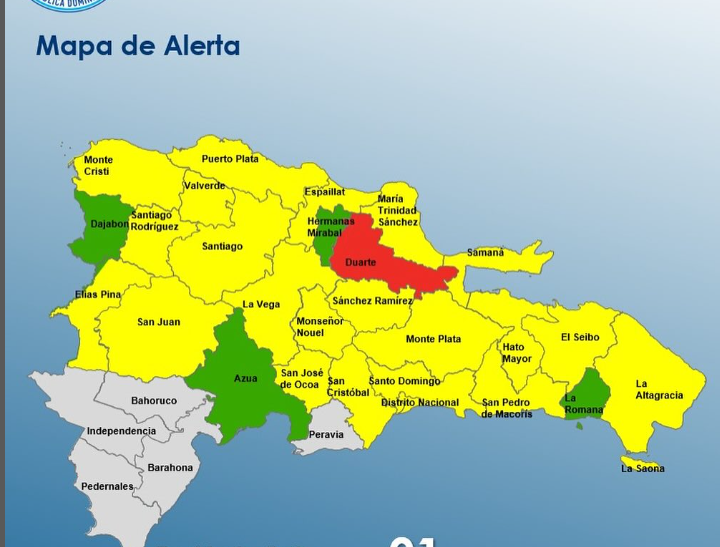 Santo Domingo RD–El Centro de Operaciones de Emergencia (COE), mantiene 01 provincia en alerta roja, 21 y al Distrito Nacional en amarilla y 04 en verde, debido a que una vaguada continúa provocando un ambiente húmedo e inestable, generando fuertes lluvias, tronadas y ráfagas de viento.