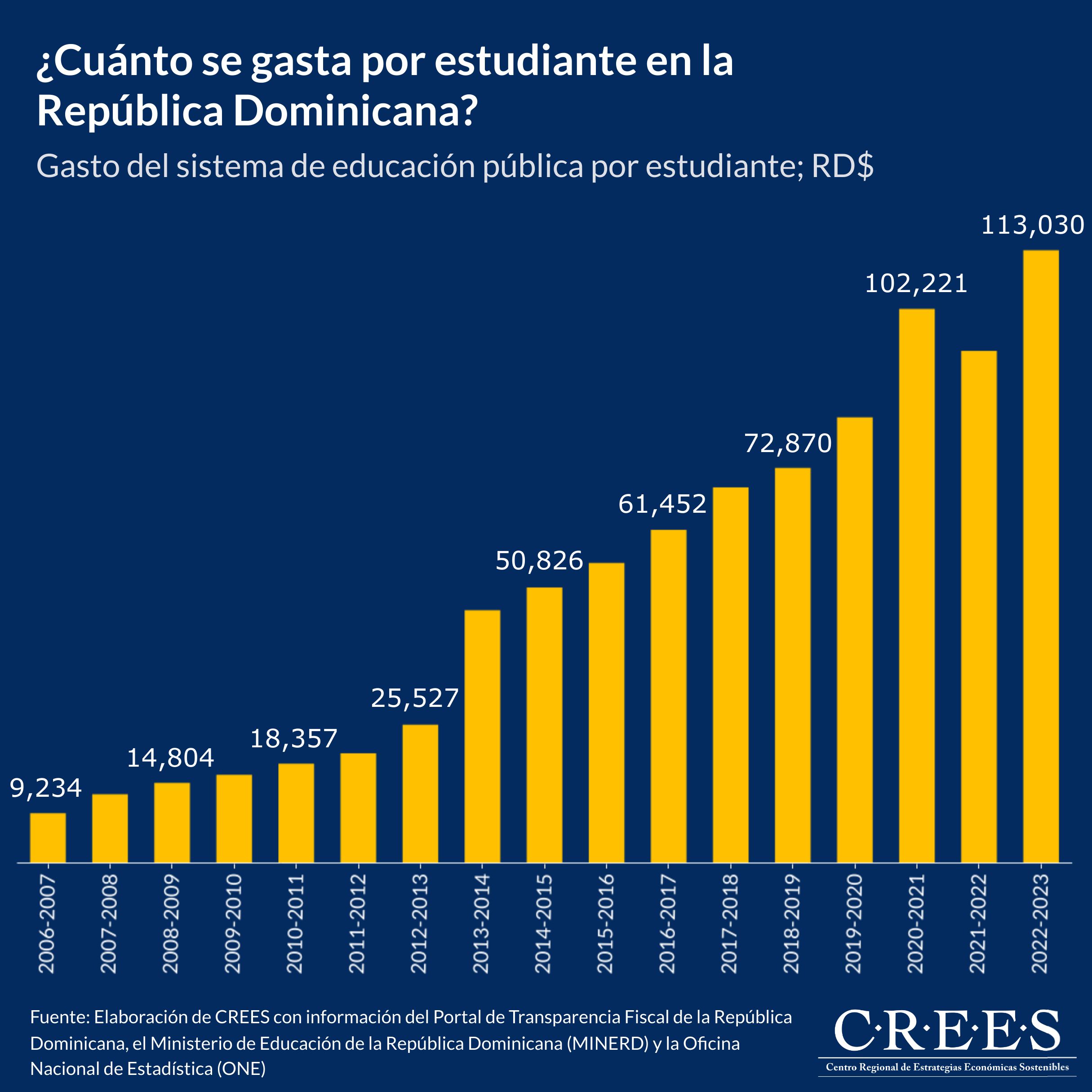 Santo Domingo, RD.- Un análisis del gasto en educación en la República Dominicana realizado por el Centro Regional de Estrategias Económicas Sostenibles, CREES, indica que para el año escolar 2022-2023 se destinaron RD$113,029.5 por estudiante dentro del sistema de educación preuniveritaria, lo que representó un aumento de RD$18,555.5, es decir, un 19.6% más que en el periodo escolar anterior.