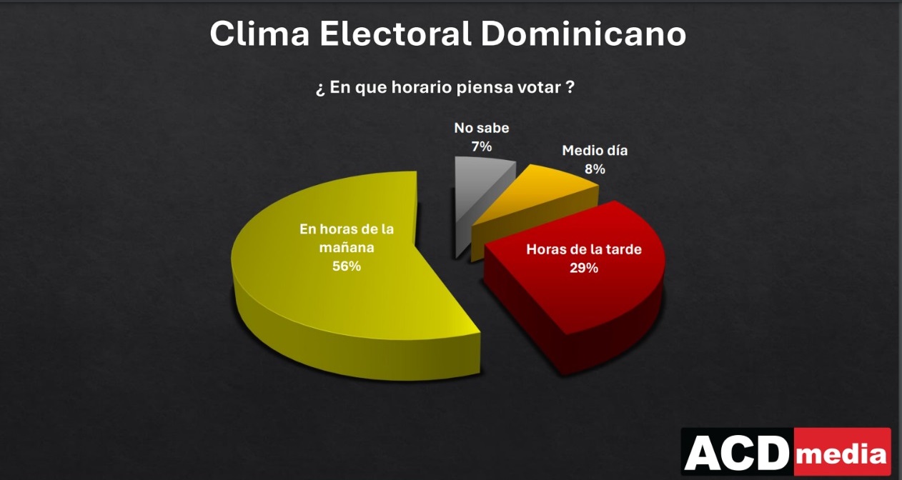 SANTO DOMINGO, RD.- La mayoría de dominicanos con derecho al voto acudirá a las urnas el próximo domingo 19 en horas de la mañana y una escasa cantidad contempla hacerlo en horas de la noche, de acuerdo a las Decima quinta entrega de la encuesta ACD Media dada a conocer esta semana.