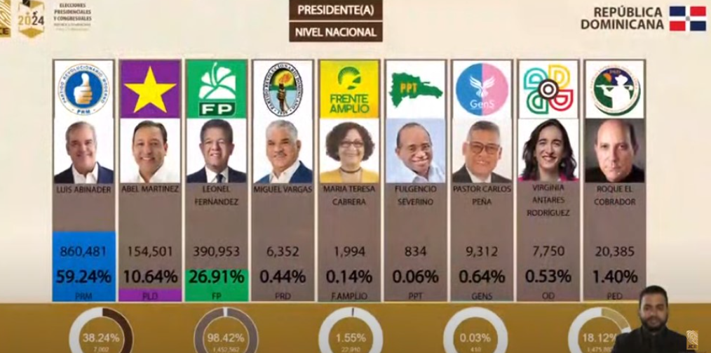 De acuerdo con primer boletín emitido por la Junta Central Electoral, el presidente Abinader tiene el 59.24%, Leonel Fernández, candidato presidencial de la Fuera del Pueblo tiene un 26.91%, Abel Martínez, candidato presidencial del PLD tiene un 10.64%, y Miguel Vargas, candidato del PRD tiene un 0.44%.