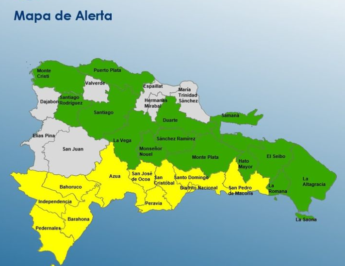 Santo Domingo RD–El Centro de Operaciones de Emergencia(COE), informó que mantiene 10 provincias y al Distrito Nacional en alerta amarilla y 14 en verde, debido a que un sistema de baja presión que se localiza al suroeste del país y la incidencia de una vaguada en los niveles medios y altos de la troposfera ubicada próximo a la porción oriental de Cuba, mantendrán las condiciones atmosféricas muy propicias para que presenten aguaceros siendo moderados a fuertes en ocasiones, tormentas eléctricas y ráfagas de viento.