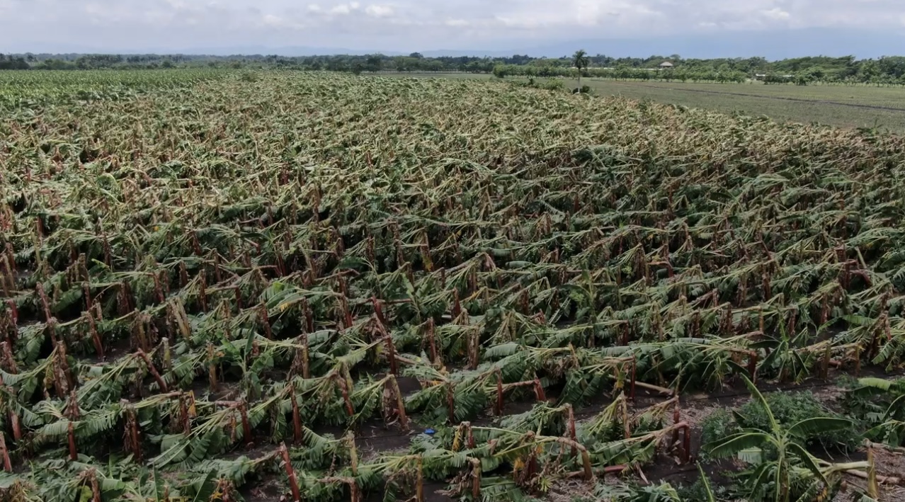 Los ventarrones han provocado daños significantes a plantaciones de plátano y guineo en las provincias Montecristi, Hermanas Mirabal, Espaillat, La Vega y Duarte. Pero también de otros frutos menores como yuca, maíz y ajíes.