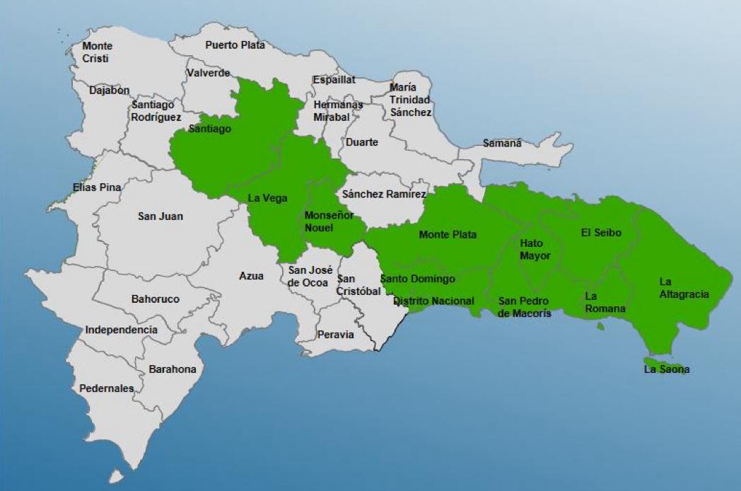 Las provincias en alerta son Santiago, Monseñor Nouel, San Pedro de Macorís, La Romana, La Altagracia, La Vega, Hato Mayor, El Seibo, Monte Plata, Santo Domingo y el Distrito Nacional.