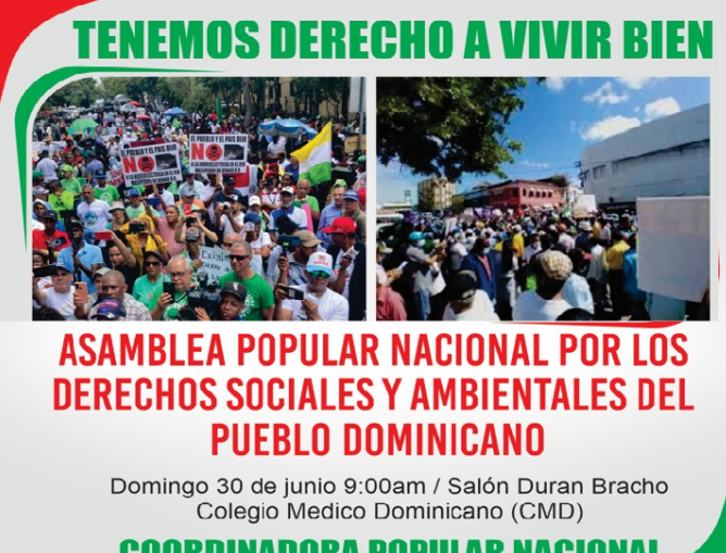 Santo Domingo RD–La Coordinadora Popular Nacional ha anunciado su próxima Asamblea Popular Nacional por los Derechos Sociales y Ambientales del Pueblo Dominicano, la cual está programada para las 9:00 am del domingo 30 de junio. Este encuentro, que se realizará en el Salón Durán Bracho del Colegio Médico Dominicano (CMD), busca consolidar los esfuerzos de los movimientos sociales y ambientales en un frente unificado y eficaz.