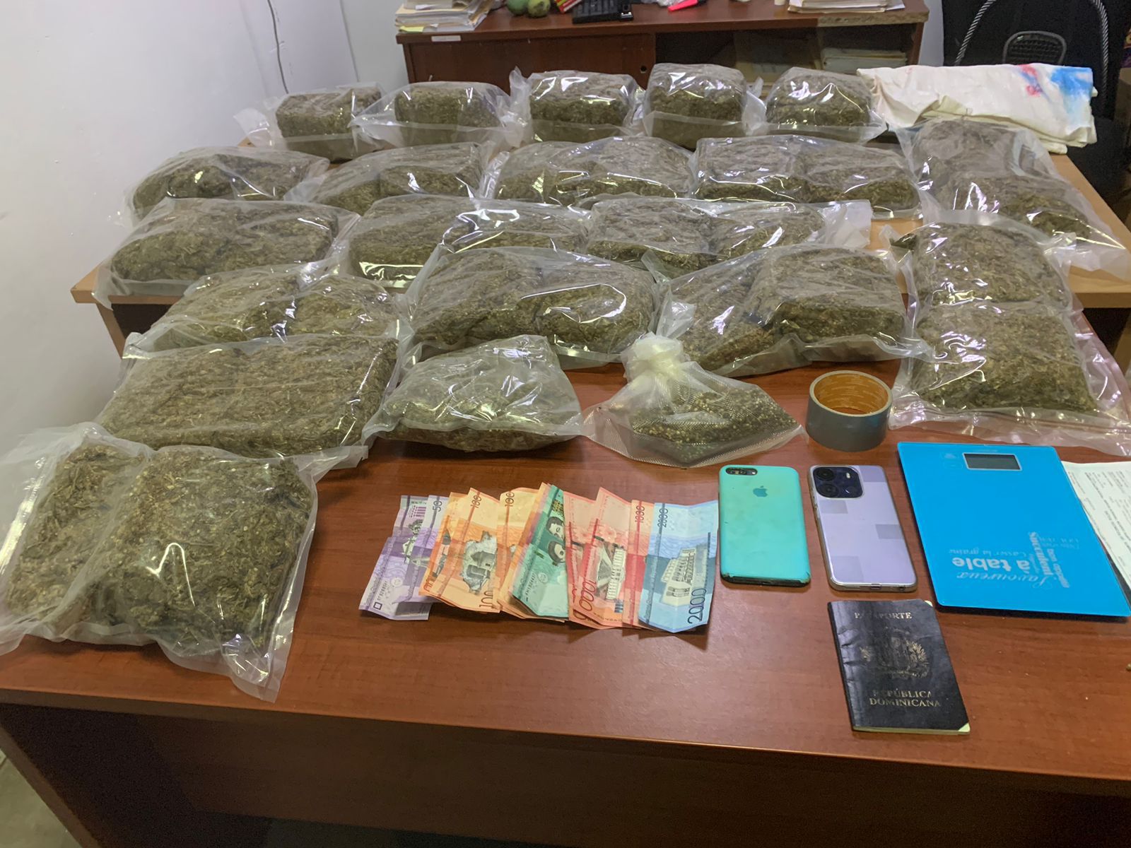 Durante las intervenciones fueron confiscadas 21 pacas de presunta marihuana, con un peso aproximado de 39.59 libras, una balanza digital, 6,200 pesos en efectivo, cuatro celulares, un chaleco antibalas, múltiples municiones, dos pistolas, una marca S&W, calibre 9mm, serie No. THD6942 y otra marca no legible, calibre 9mm, serie No. EFC-1490302, sin documentos.
