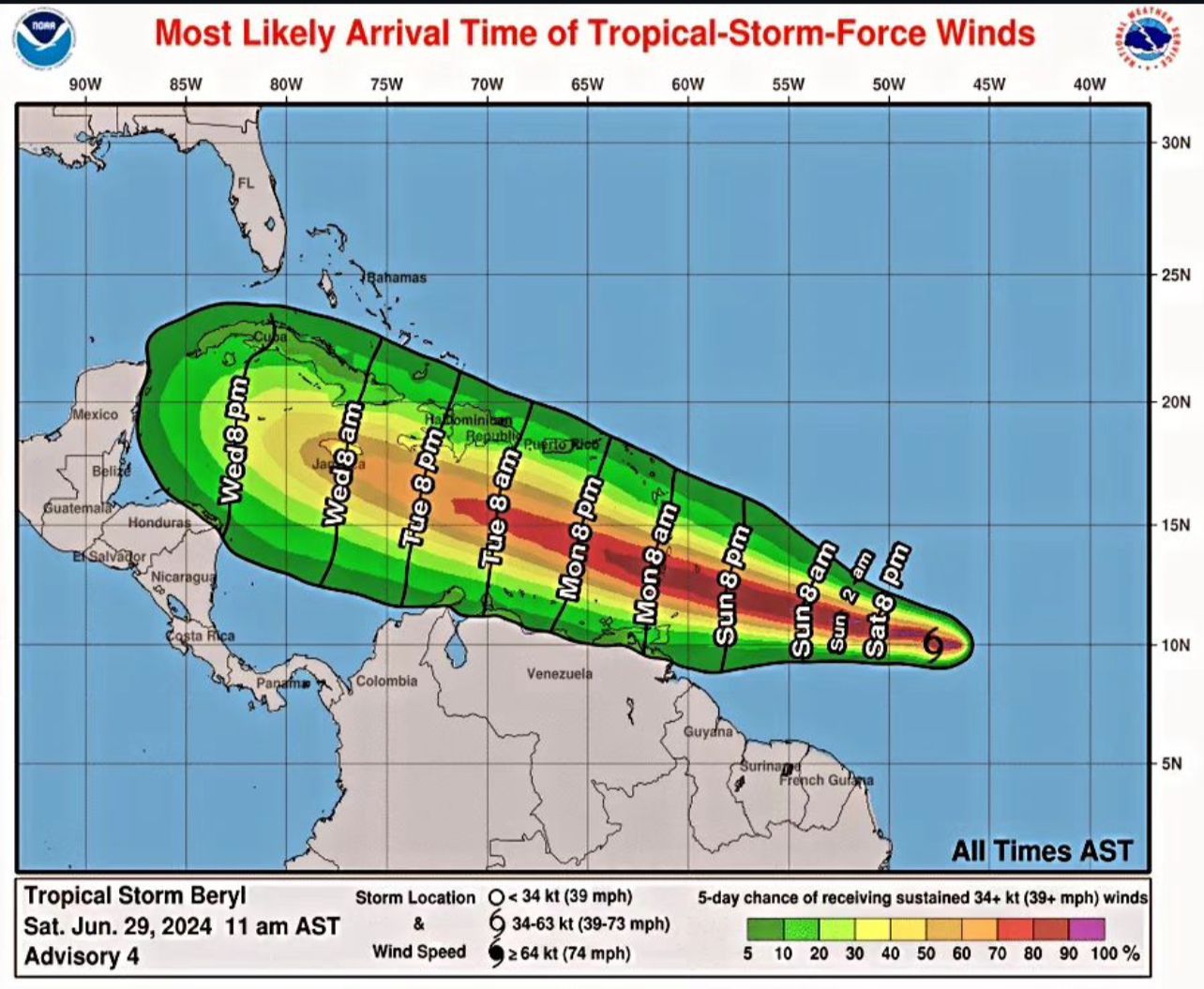 Beryl, el primer huracán de la temporada atlántica de 2024, se fortaleció hasta convertirse en una tormenta “muy peligrosa” de categoría 3 este domingo por la mañana mientras amenazaba el sureste del Caribe, informó el Centro Nacional de Huracanes de Estados Unidos (NHC). Con “vientos que amenazan la vida”, Beryl es “ahora un muy peligroso huracán de categoría 3”, dijo el centro en su último boletín, al tiempo que detalló que “se esperan marejadas ciclónicas en las islas de Barlovento a partir del lunes por la mañana”.