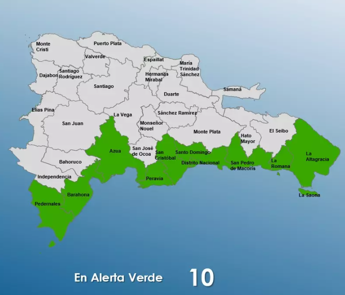 Las provincias en alerta verde son: Santo Domingo, Distrito Nacional, Pedernales, Barahona, San Cristóbal, Paravia, Azúa, La Romana, San Pedro de Macorís y La Altagracia.