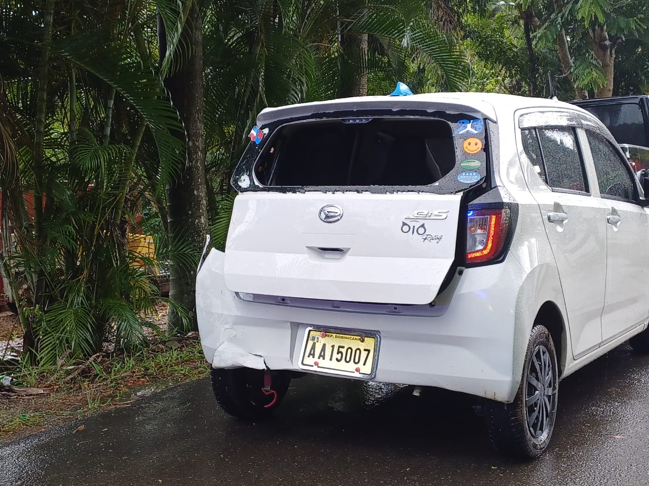 El vehículo presenta daños diversos, que las autoridades no han revelado si fueron hechos por los alegados secuestradores o por la misma joven al chocar.