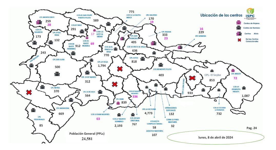 Estadísticas de la Dirección General de Servicios Penitenciarios y Correccionales (DGSPC) detalla que, a pesar de ese descenso, las cárceles dominicanas para enero de 2024 tenían una sobrepoblación de 9,929 privados de libertad, tanto en los Centros de Corrección y Rehabilitación (CCR), correspondientes al nuevo modelo, como en los Centros de Privación de Libertad (CPL), del viejo modelo.
