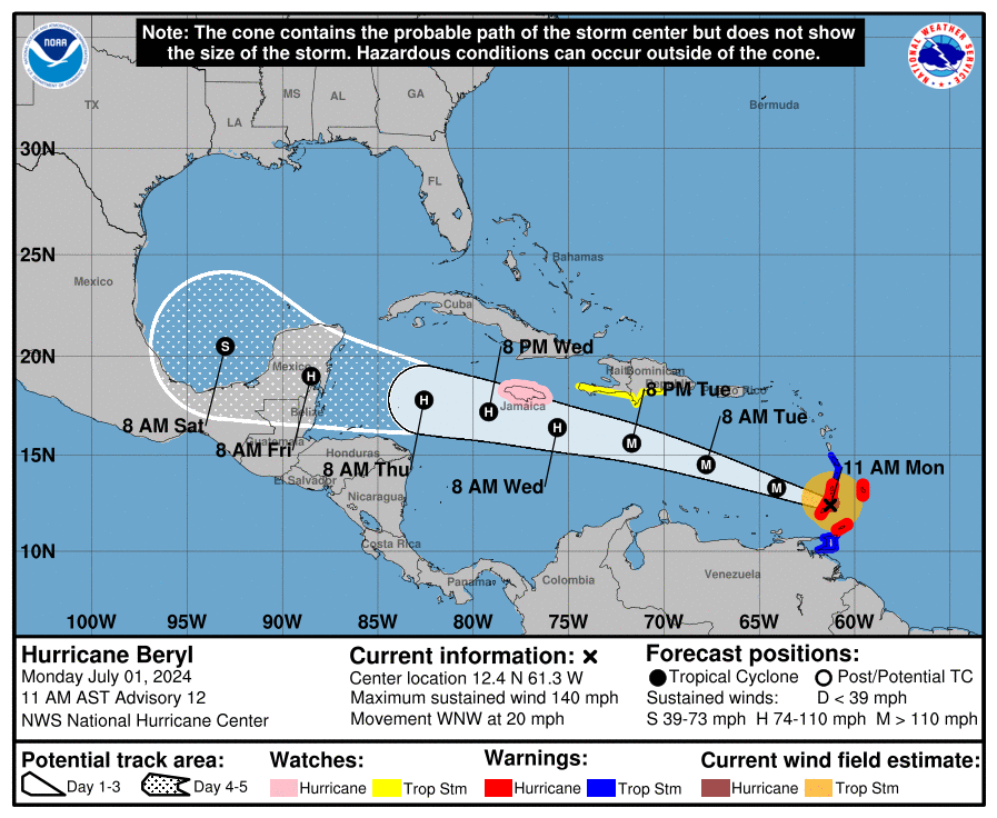 Dijo que a las 11:00 de la mañana el ojo del Huracán Beryl se localizó cerca de la latitud 12.4 Norte, longitud 61.3 Oeste, con movimiento hacia el oeste-noroeste cerca de 20 mph (31 km/h.