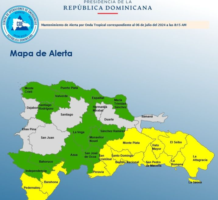 Santo Domingo RD–El Centro de Operaciones de Emergencia (COE), informó que mantiene 11 provincias y al Distrito Nacional en alerta amarilla y 13 en verde, debido a que las condiciones meteorológicas estarán influenciadas por la incursión de una masa de aire con menor contenido de humedad junto a partículas de polvo sahariano.