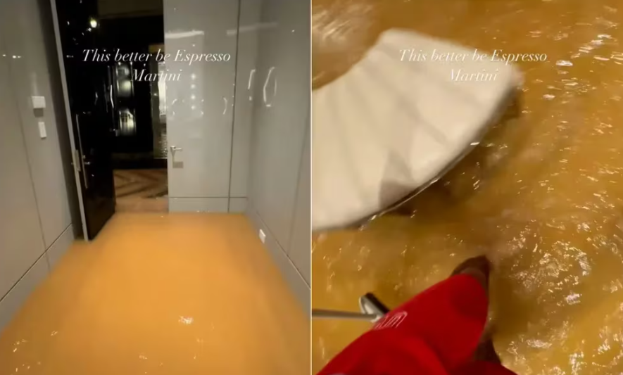La casa, ubicada en el exclusivo vecindario de Bridal Path, conocida como “The Embassy”, se encontraba con agua turbia que alcanzaba al menos hasta los tobillos. Drake intentó mantener el ánimo a través del humor, escribiendo en el video “Esto mejor que sea un Espresso Martini”.