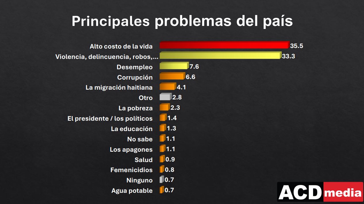 Santo Domingo.-El alto costo de la vida, la violencia y la delincuencia, el desempleo, la corrupción y la migración haitiana siguen siendo los principales problemas que afectan a los dominicanos, de acuerdo a la más reciente entrega de la Encuesta Nacional de Opinión Pública ACDMedia.