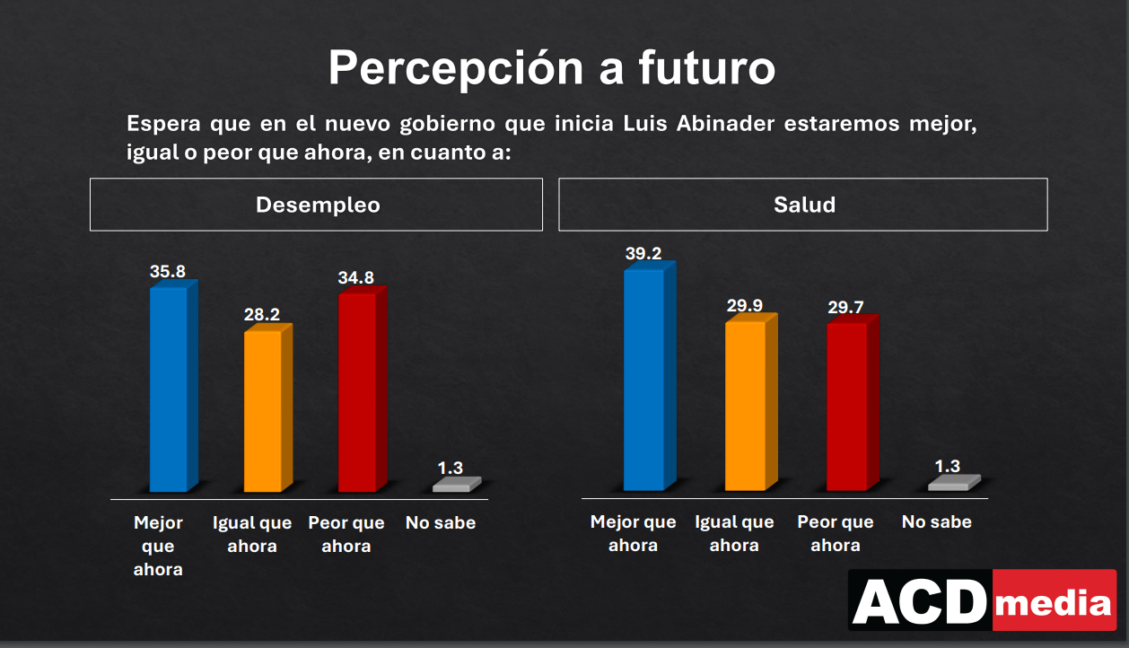 Santo Domingo RD– El grupo de comunicación ACD Media reveló en su 16ª edición de la encuesta nacional de opinión publica, que la mayoría de la población indicó que el desempleo y la salud estarán mejor que ahora, en esta nueva gestión de gobierno del presidente Luis Abinader.