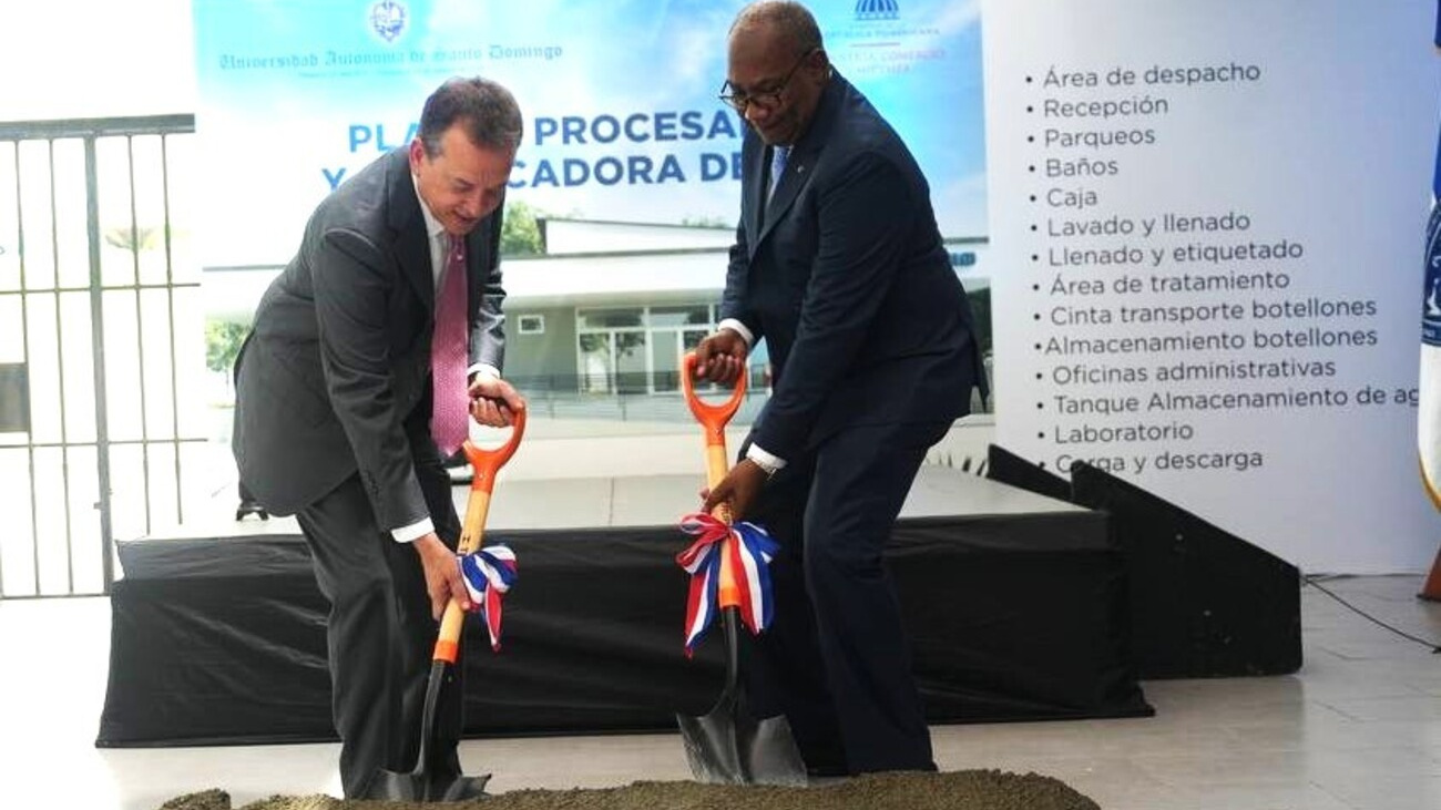 Santo Domingo.- El rector de la Universidad Autónoma de Santo Domingo (UASD), maestro Editrudis Beltrán Crisóstomo, y el ministro de Industria, Comercio y Mipymes, Víctor Bisonó Aza, iniciaron los trabajos de construcción de una nueva planta purificadora y envasadora de agua en terrenos universitarios, durante un emotivo acto celebrado en el comedor de la academia estatal.