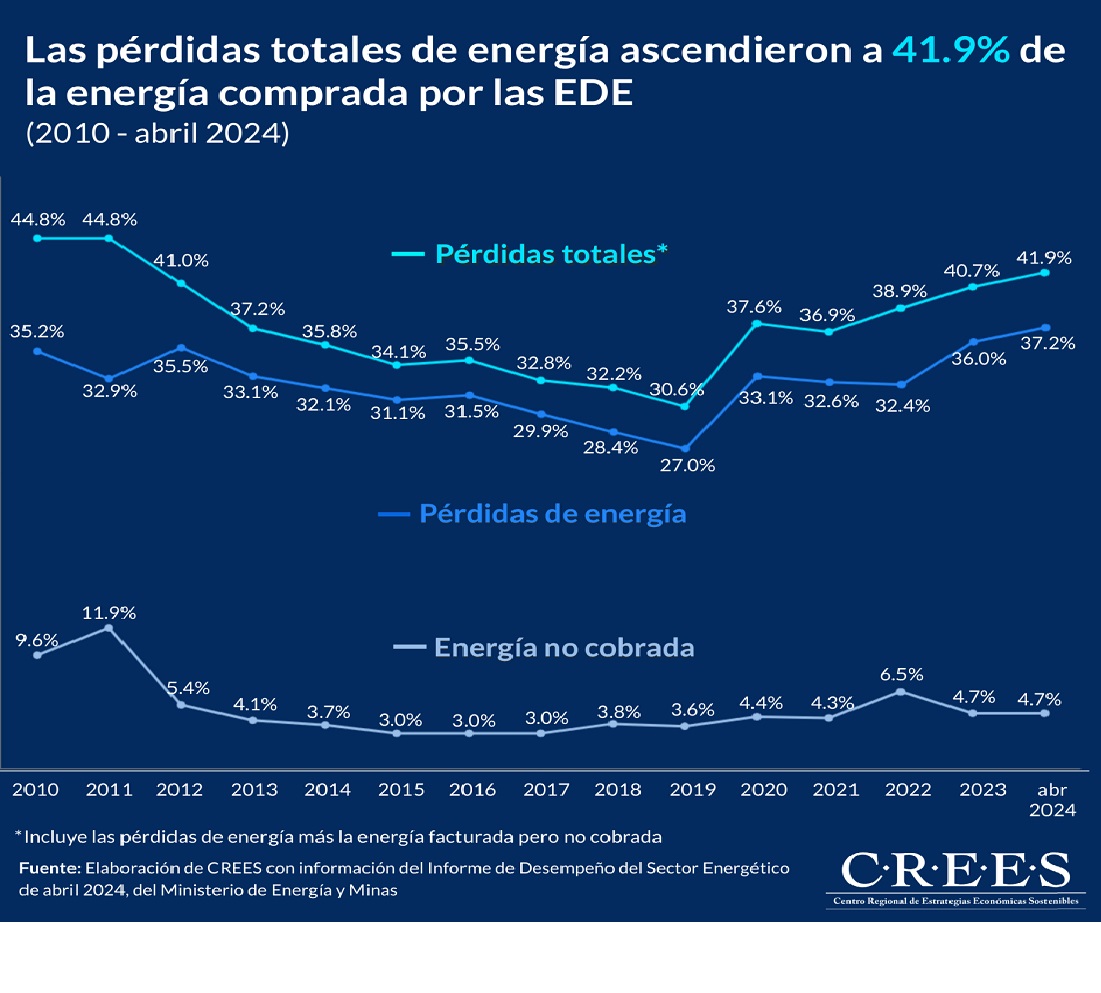 Al cuarto mes del 2024 las pérdidas totales acumuladas de las empresas distribuidoras de electricidad (EDE) alcanzaron el 41.9%. Es decir, por cada 100 GWh de energía comprada las EDE perdieron el equivalente a 42 gigavatios-hora (GWh). Lo que equivale a US$394.8 millones solo por pérdidas de energía comprada y no cobrada a los usuarios. Esto según el último informe de desempeño elaborado por el Ministerio de Energía y Minas.