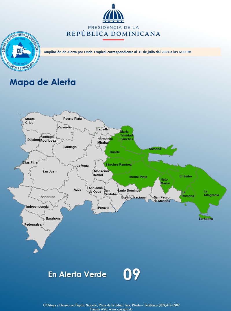 Santo Domingo, RD.- La Dirección del Centro de Operaciones de Emergencias (COE), informó que de acuerdo al boletín meteorológico del día de hoy, del Instituto Dominicano de Meteorología