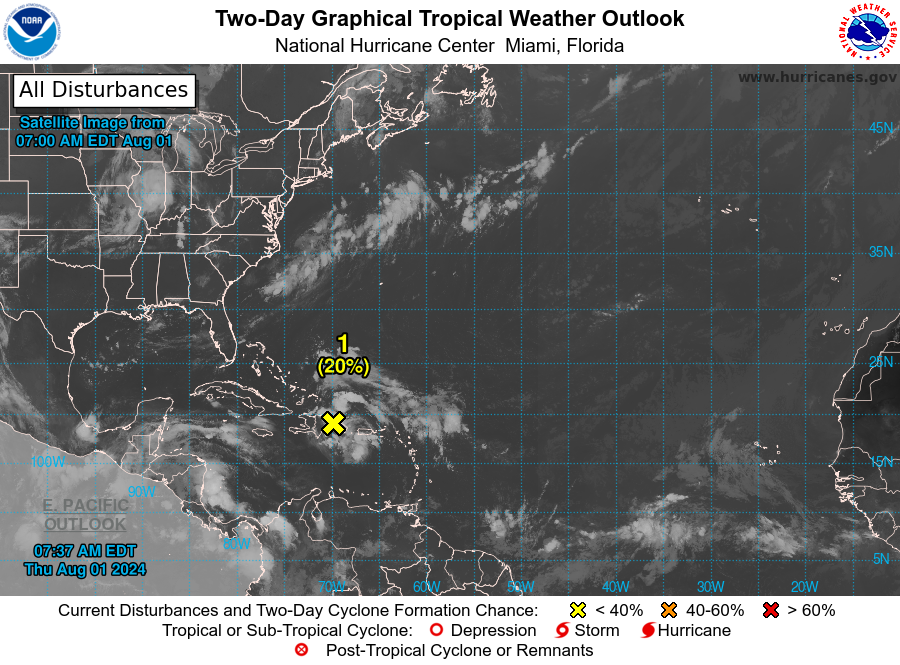 Sin embargo, dijo que el fenómeno atmosférico está produciendo una gran área de aguaceros y tormentas eléctricas desorganizadas sobre la Isla Española, Puerto Rico, las Islas Vírgenes y las aguas adyacentes del Atlántico suroeste y el noreste del Mar Caribe.
