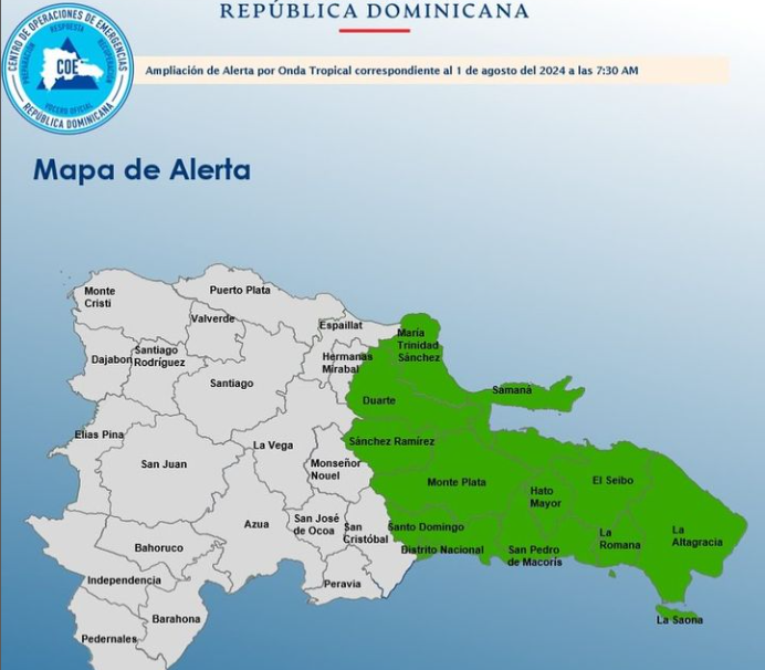 Santo Domingo, RD.- El Centro de Operaciones de Emergencias (COE), aumento a 11 provincias y el Distrito Nacional en alerta verde, debido a que la cercanía de una activa onda tropical, al este de Puerto Rico y una vaguada en altura, producirán nublados con aguaceros, tronadas y ráfagas de viento en varios puntos del noreste, sureste y la Cordillera Central.