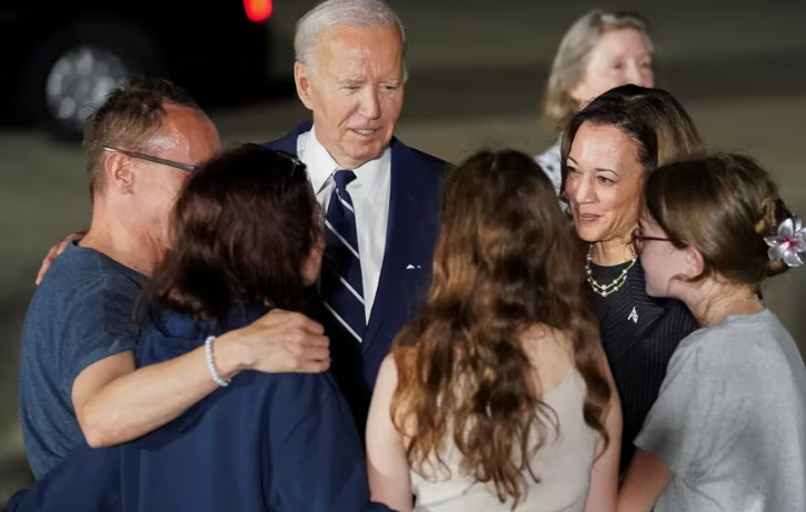 Biden, acompañado de la vicepresidenta, Kamala Harris, recibió a los periodistas Evan Gershkovich y Alsu Kurmasheva y el ex infante de marina Paul Whelan a los pies del avión que los traía desde Ankara (Turquía) en la Base Aérea de Andrews (Maryland).