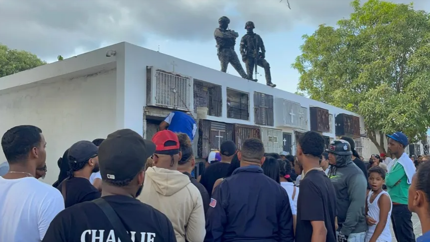 Mientras el sepelio, decenas de agentes se mezclaron con familiares y amigos que en medio de su dolor lloraban la Defuncion de «Junior Boca Chula». Otros tomaban bebidas alcohólicas, durante el ataúd permanecía rodeado de hombres, mujeres y niños, quienes entregaron el último adiós al hombre oriundo del sector de Baracoa de esta ciudad.