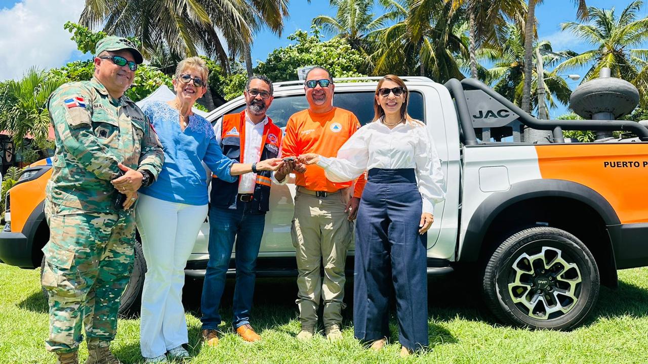 El vehículo de La Vega se entregó en el edificio de la Comisión Nacional de Emergencias (CNE) en el Distrito Nacional, en un acto encabezado por el director Salas y la gobernadora, Luisa Jiménez. La representante del Poder Ejecutivo indicó que esta camioneta viene a reforzar la logística operacional de la Defensa Civil local, a la que describió como un ejemplo.