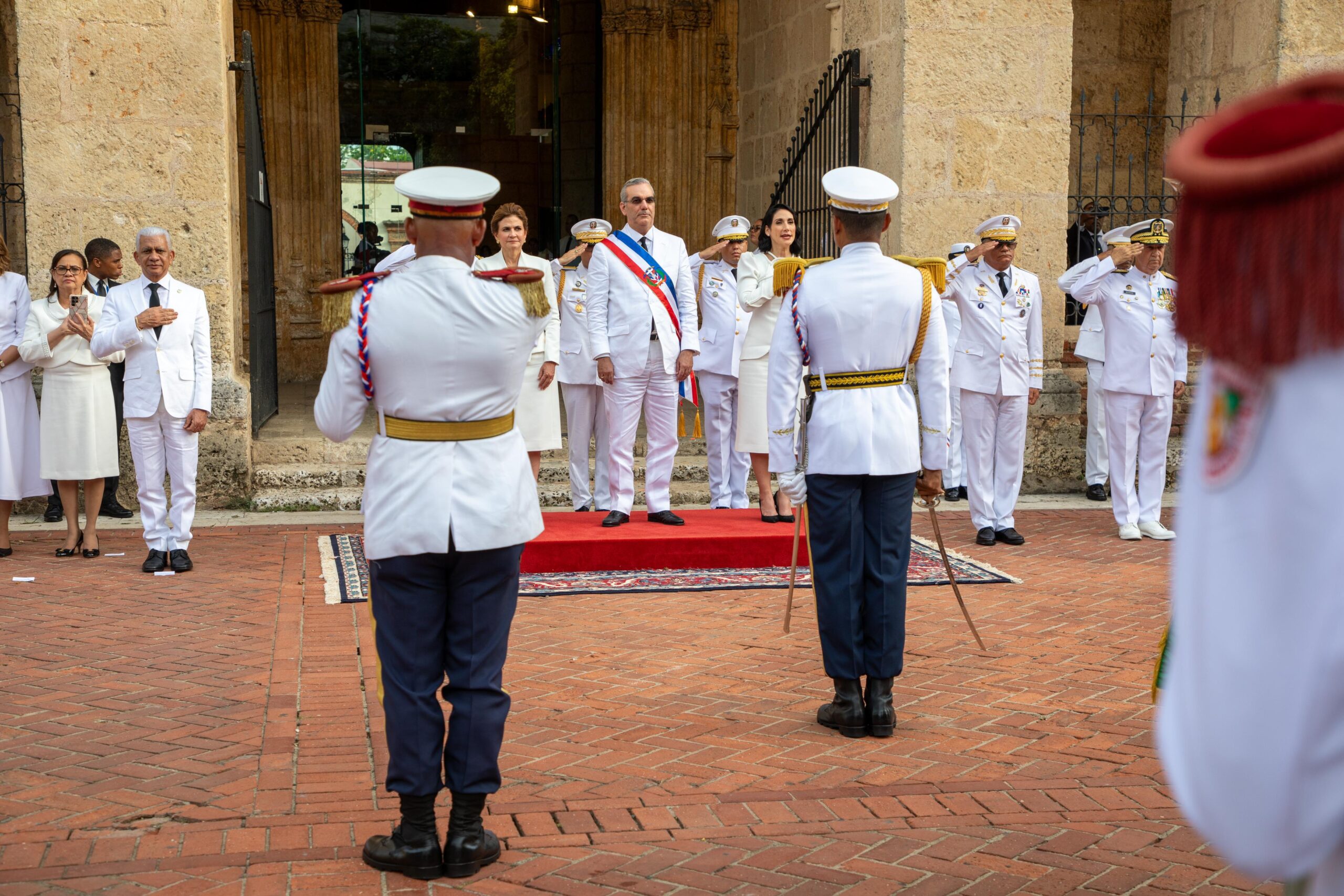 A su llegada al monumento que representa el compromiso, la valentía y el patriotismo de los fundadores de la República Dominicana, el mandatario fue recibido con los honores militares de estilo con la entonación de las notas del Himno Nacional junto a una salva de 21 cañonazos, a cargo del Regimiento de la Guardia de Honor del Ministerio de Defensa.