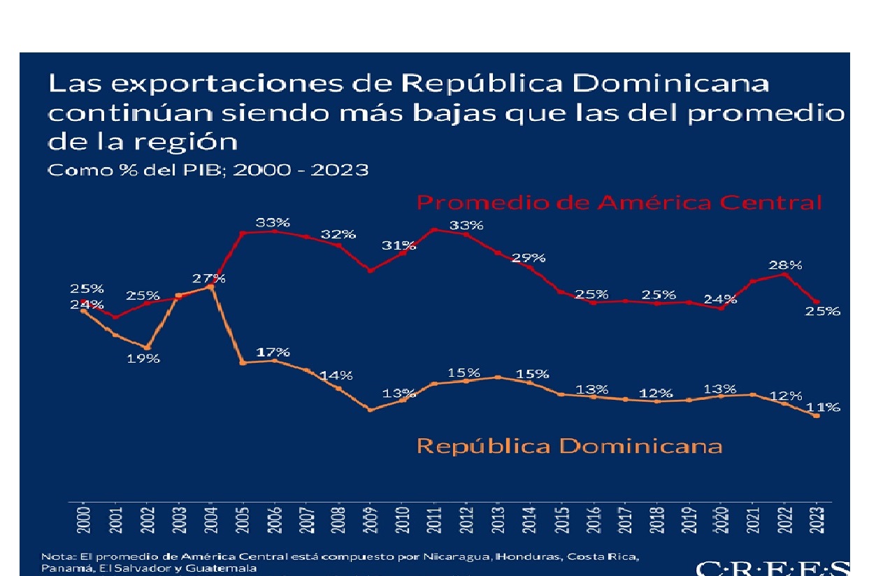 Santo Domingo, RD.- Un análisis económico sobre el renglón de las exportaciones realizado por el Centro Regional de Estrategias Económicas Sostenibles, CREES, advierte que las exportaciones de la República Dominicana, como proporción de su Producto Interno Bruto (PIB), han mostrado un desempeño inferior al promedio de América Central.