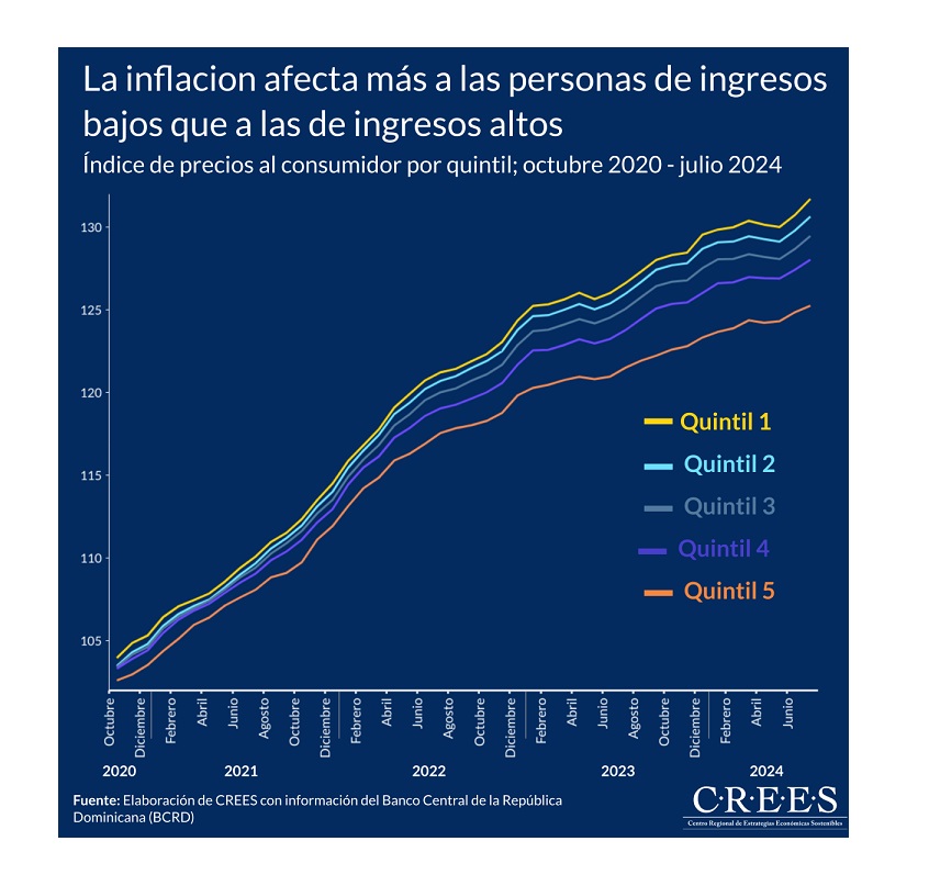 Santo Domingo, RD.- El Centro Regional de Estrategias Economicas Sostenibles, CREES, revela que en la República Dominicana la inflación interanual desde julio de 2023 hasta julio de 2024 fue de 3.54% siendo de las tasas más bajas en los últimos años, pero esto no se refleja de la misma forma para cada sección de la sociedad dominicana, llegando a ser más afectados los grupos con ingresos más bajos que los que poseen ingresos altos.