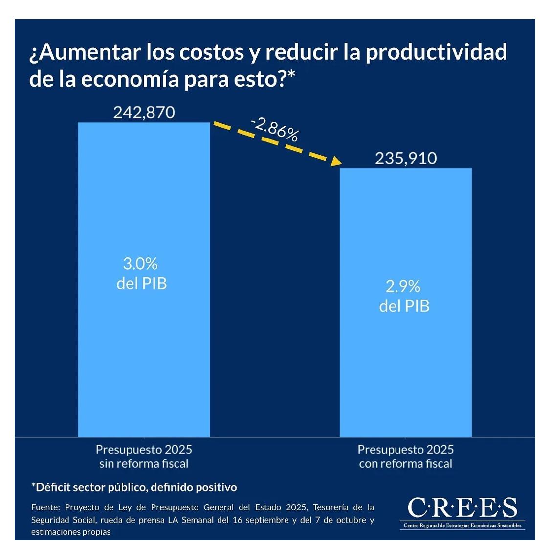 República Dominicana.- El Centro Regional de Estrategias Económicas Sostenibles, CREES, al analizar el impacto de la Reforma Fiscal sometida por el Gobierno presentó una tabla evaluativa que muestra que el déficit fiscal de 2025 permanecería igual al del proyecto de presupuesto. “El déficit esperado, tanto sin reforma como con reforma andaría entorno al 3.0% del PIB,” indicó.