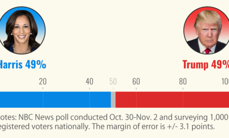 Cadena NBC News afirma Dolald Trump y Kamala Harris están empatados con 49%