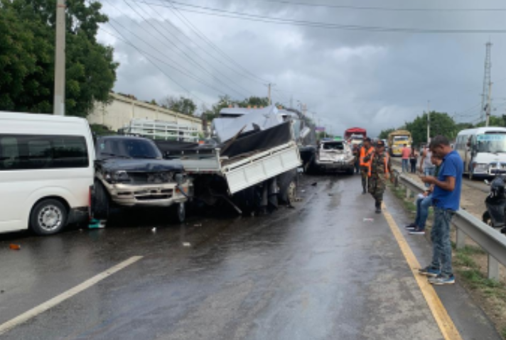 SANTIAGO.- Un accidente de tránsito múltiple ocurrido la tarde de este jueves en la autopista Duarte, a la altura del sector Estancia del Yaqué en el municipio Villa Bisonó, Navarrete, dejó al menos 10 personas heridas y provocó una gran congestión vehicular en la zona.