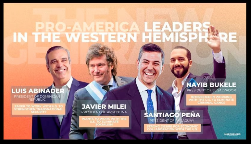 Desde esta perspectiva, cuando detrás del cortinado ya se sabía que sería designado por Trump, Rubio posteó en X un comentario sobre el alineamiento ideológico de Javier Milei (Argentina), Santiago Peña (Paraguay), Luis Abinader (República Dominicana) y Nayib Bukele (El Salvador).