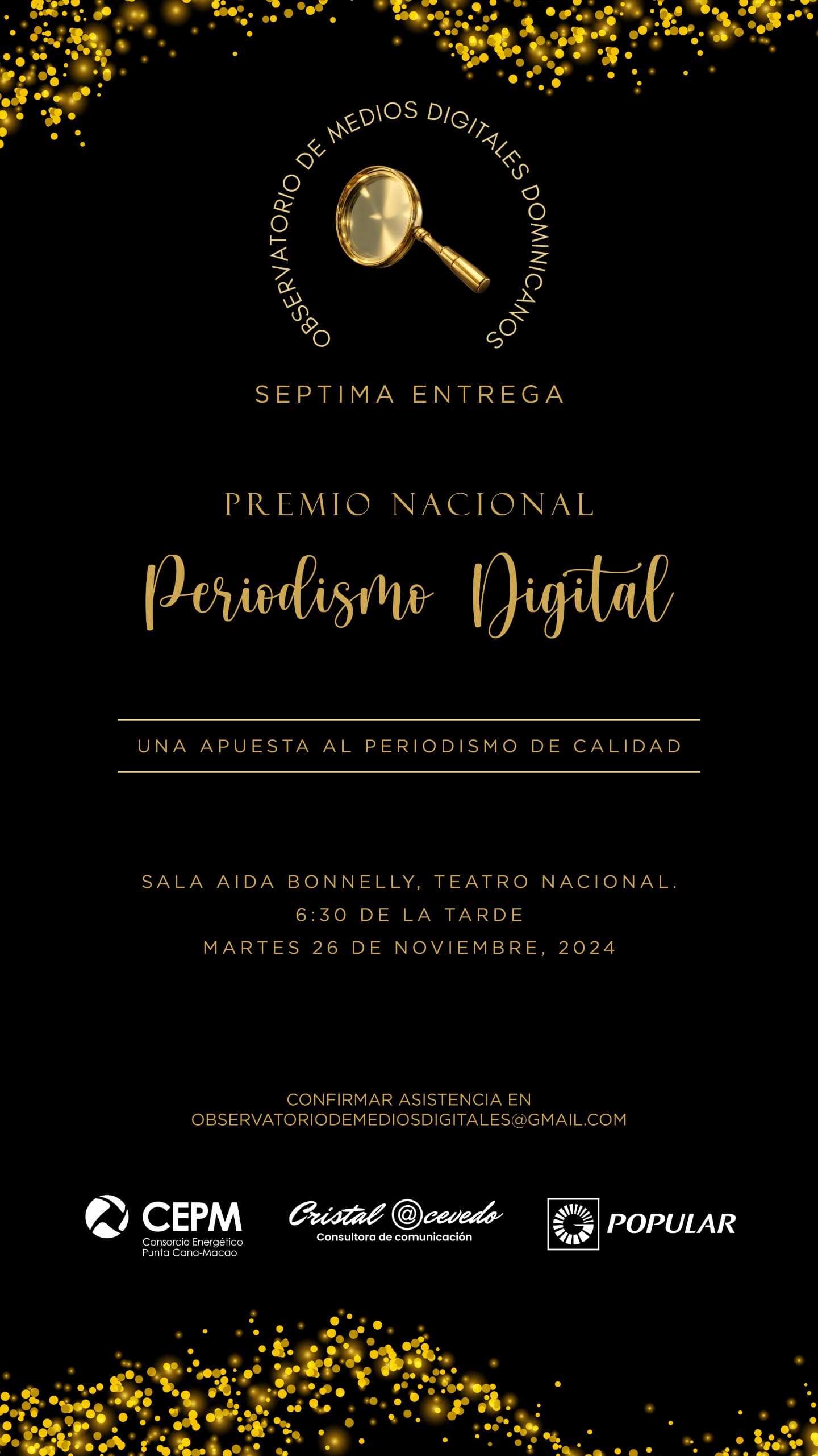 El Observatorio de Medios Digitales Dominicanos anunció este viernes a los nominados al Premio Nacional de Periodismo Digital 2024, evento a realizarse el próximo 26 de noviembre con el patrocinio del Banco Popular y el Consorcio Energético Punta Cana-Macao.