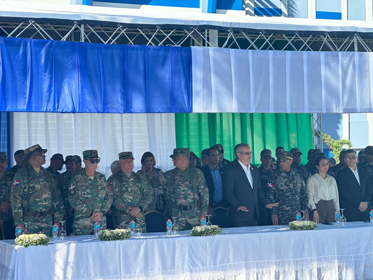 Acompañaron al mandatario, el ministro Administrativo de la Presidencia, José Ignacio Paliza; el teniente general Carlos Antonio Fernández Onofre, ministro de Defensa; Luis Ernesto García, comisionado ejecutivo para la Reforma Policial; Mu-Kien Sang Ben, coordinadora de la reforma educativa; Yeni Berenice Reynoso, procuradora fiscal adjunta, entre otros funcionarios civiles y militares.