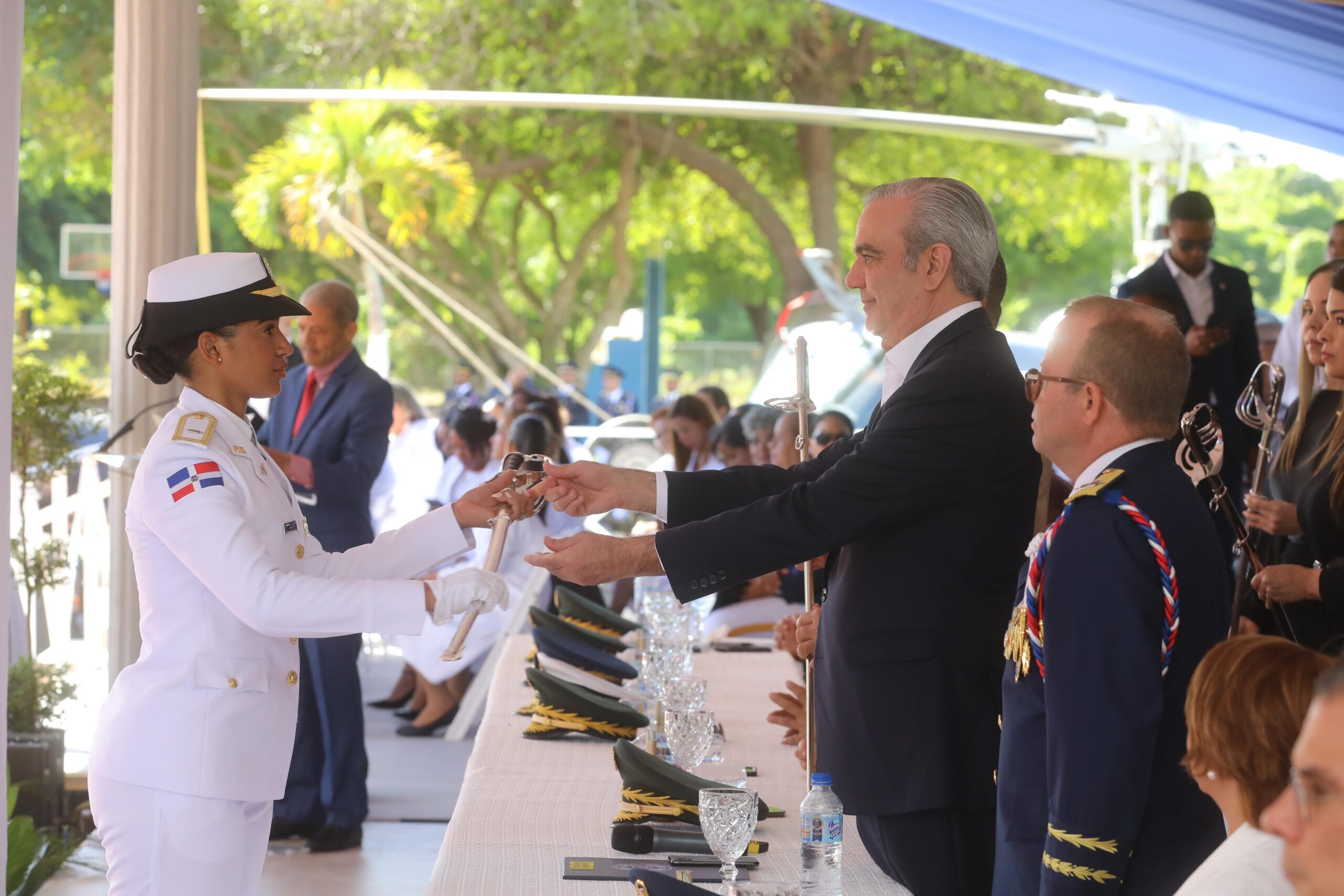 Tras la imposición de insignias de grado, la lectura de la orden general de ascenso y la resolución de la UNADE que acreditaron a los graduandos como licenciados en Ciencias Aeronáuticas, el Presidente Abinader tomó el juramento de honor a los nuevos oficiales y entregó los sables de mando. Acto seguido, se colocaron las alas correspondientes a cada especialidad y las madres de los graduandos entregaron los anillos de graduación.