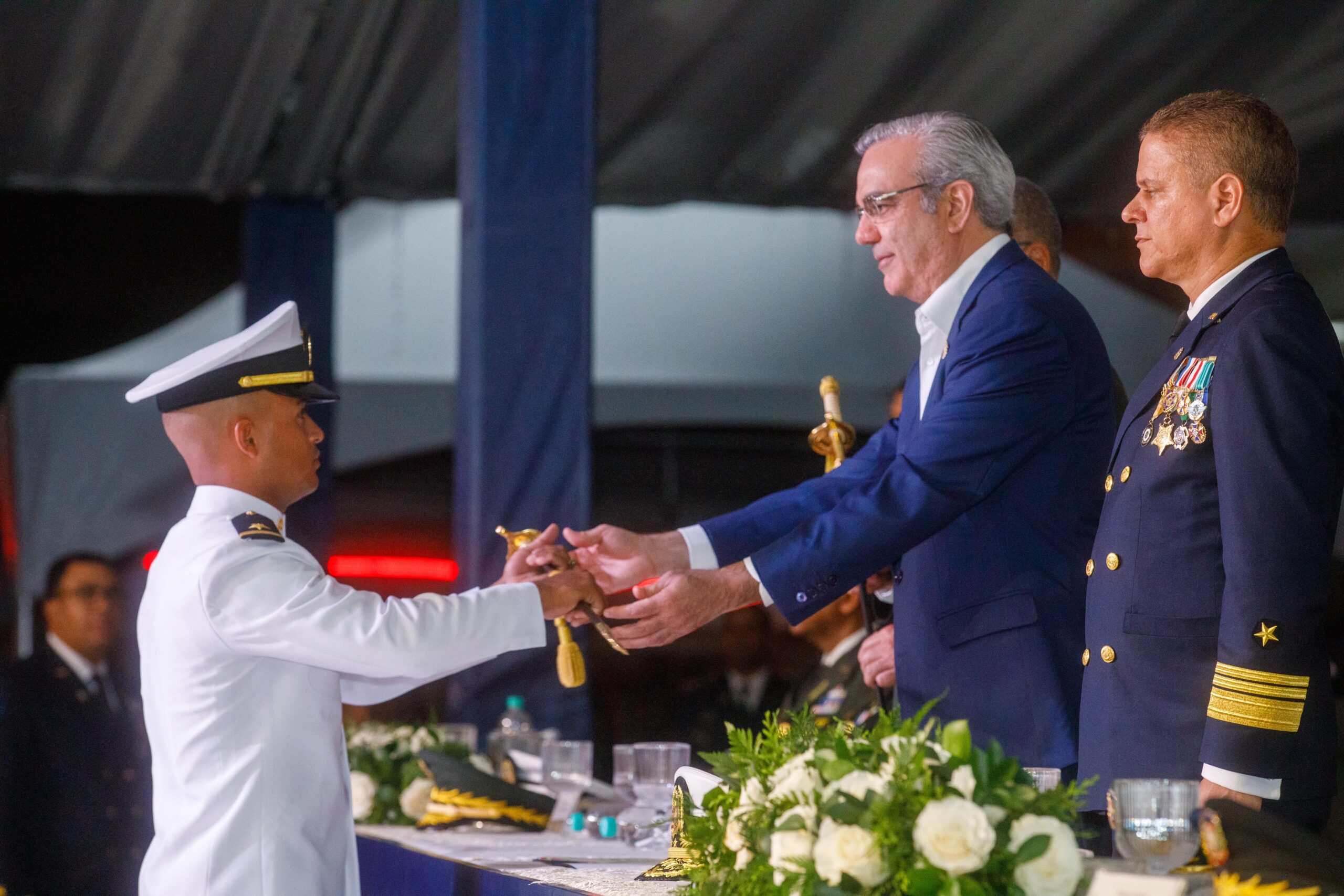 El presidente Luis Abinader encabezó esta ceremonia de graduación correspondiente a la Septuagésima Tercera (LXXIII) Promoción de Damas y Caballeros Guardiamarinas, clase 2020-2024, a quienes tomó juramento y entregó el sable de mando.