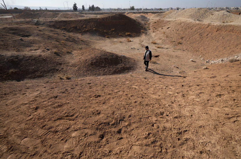 Una gran cantidad de tierra bloquea el camino hacia un recinto amurallado en las afueras de al-Qutayfa, una ciudad a unos 30 kilómetros al norte de Damasco, la capital siria. Hay silencio, salvo por el ladrido ocasional de dos perros callejeros y el leve zumbido de las líneas eléctricas que pasan por encima del recinto. Los muros de bloques de hormigón encierran un área aproximadamente del tamaño de dos campos de fútbol. Durante más de una década, el ejército de Bashar al-Assad convirtió este páramo en una fosa común, que los nuevos gobernantes de Siria consideran una de las más grandes.