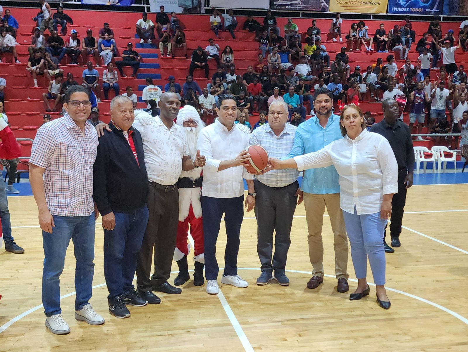 El ministro Kelvin Cruz hizo el anuncia al hacer el saque de honor en el inicio de la serie final del XXXIV Torneo de Baloncesto Superior de San Cristóbal, que disputaron los equipos los Buitres y los Lobos de Canastica.