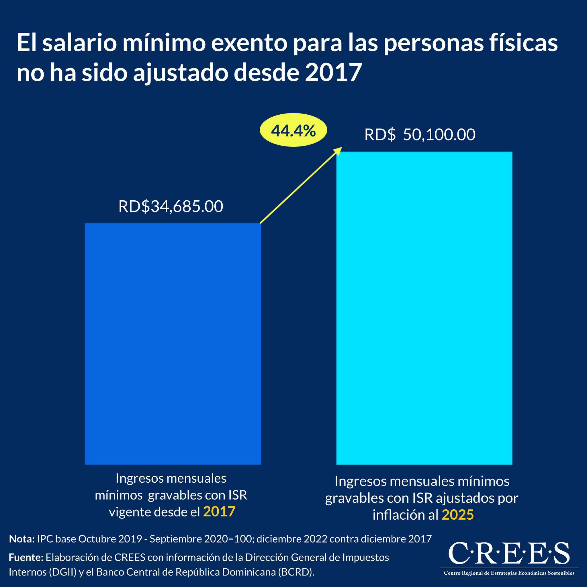 El monto exento de pagar Impuesto Sobre la Renta (ISR) a los salarios es de RD$416,220.01, lo que es igual a un salario mensual de RD$34,685.00 y de ese monto a RD$601,098.33, que equivale a un sueldo de hasta RD$50,098.33, debe tributar un 15%, que serían RD$27,743.99 de RD$184,959.95 al año y que divididos entre 12 meses serían RD$2,311.99 que se ahorraría cada empleado.