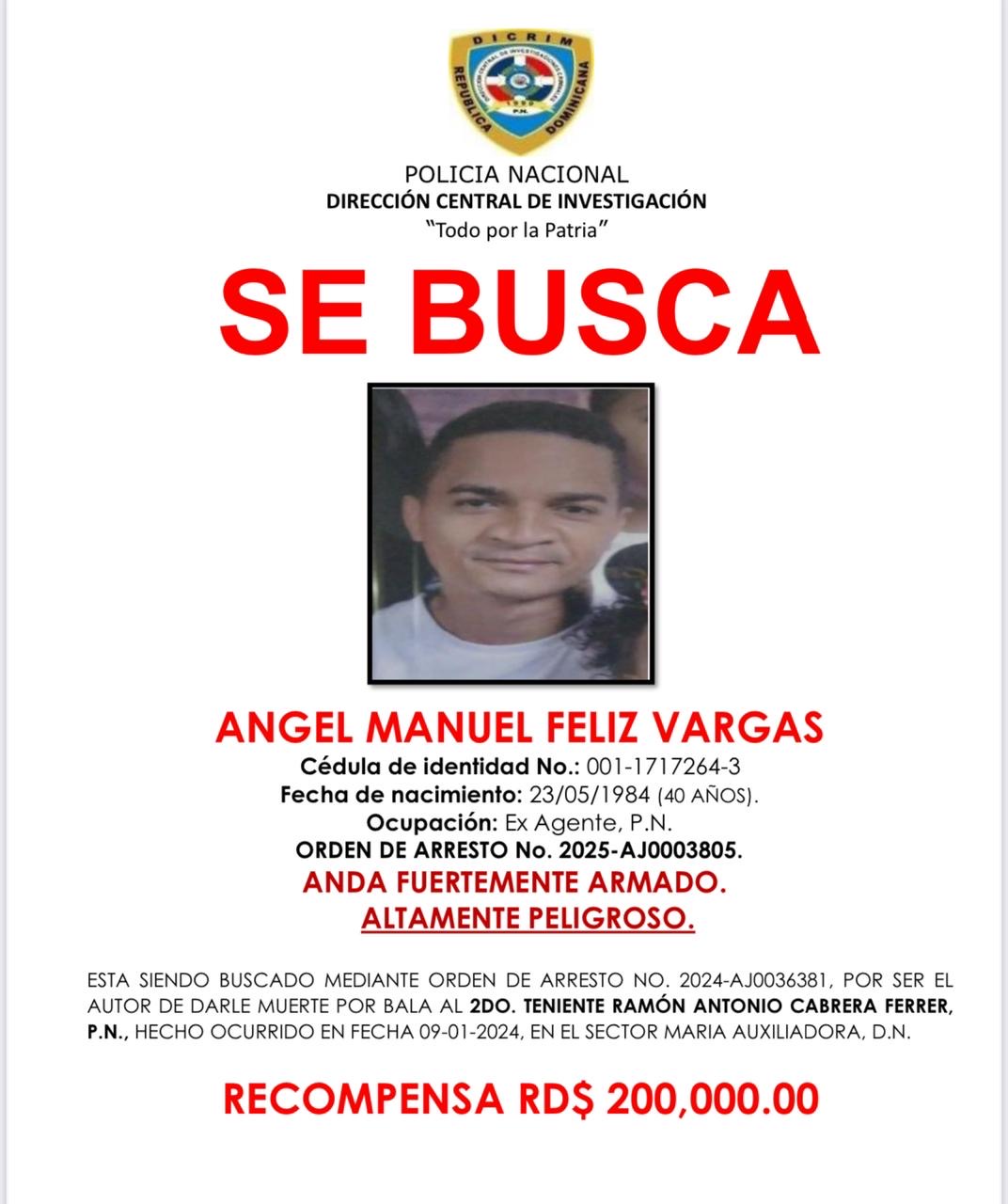 En tanto, Feliz Vargas, de 40 años, es señalado como uno de los responsables del asesinato del segundo teniente Ramón Antonio Cabrera Ferrer, ocurrido el 9 de enero de 2024 en el sector María Auxiliadora, del Distrito Nacional.