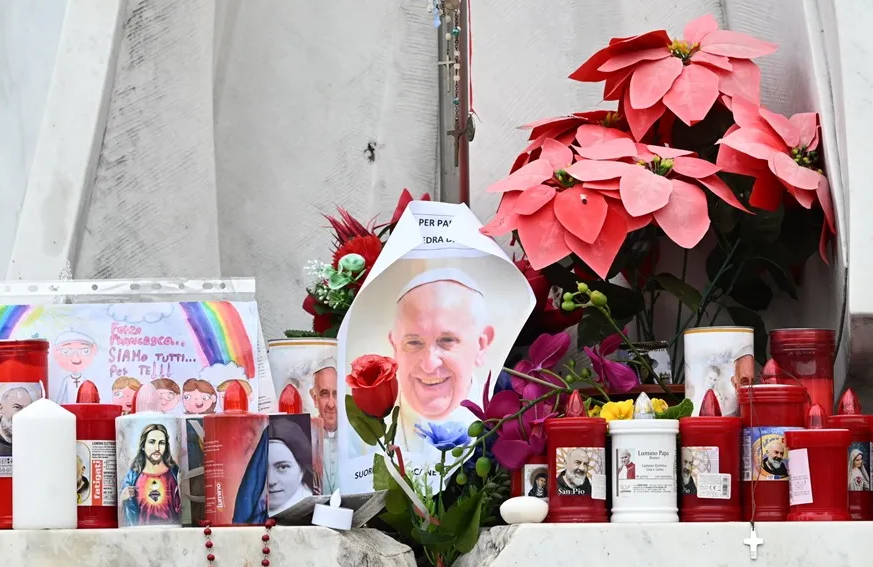 El altar improvisado que se instaló la semana pasada a los pies de la estatua de Juan Pablo II en la entrada del centro médico ha crecido significativamente en los últimos días, a medida que se conocían detalles sobre el empeoramiento del estado de salud de Francisco.