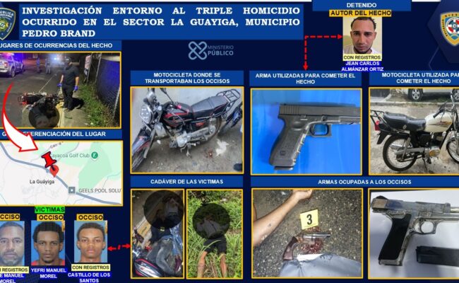 Se trata de Jean Carlos Almánzar Ortiz (Chagui), residente en el kilómetro 22 de la autopista Duarte. Asimismo, se recuerda que las víctimas son José Manuel Morel, de 28 años; Yefri Manuel Morel, de 24, y Castillo de los Santos Contreras, de 48, quienes fallecieron a causa de múltiples heridas de bala.