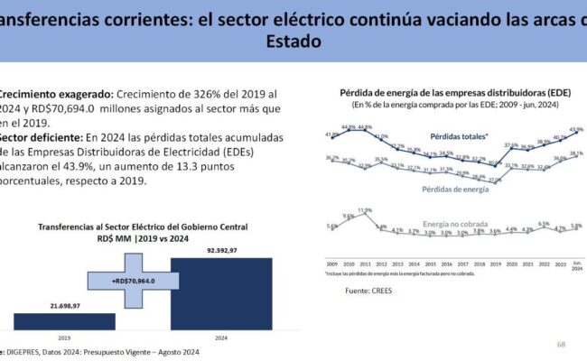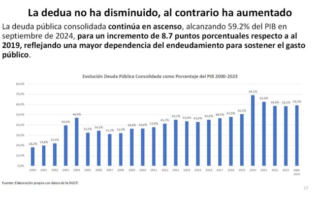 Dijo, que por el contrario, la deuda pública continúa en ascenso “alcanzando 59.2% del PIB en septiembre de 2024, para un incremento de 8.7 puntos porcentuales respecto a al 2019”.