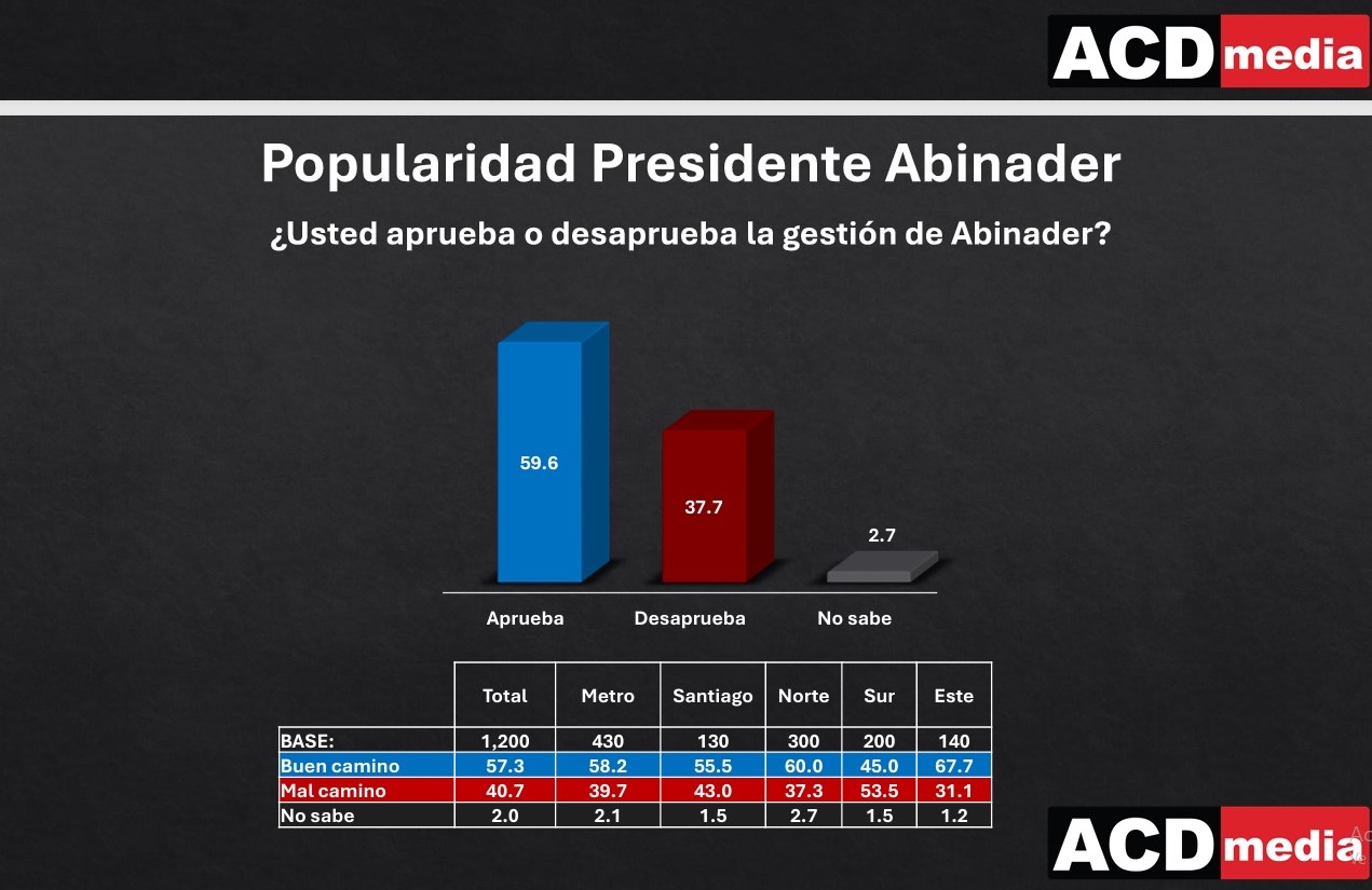 Santo Domingo, RD.-. El 59 por ciento aprueba la gestión del presidente Luis Abinader, así se determina en los resultados de la más reciente encuesta de ACD Media, publicados este martes.