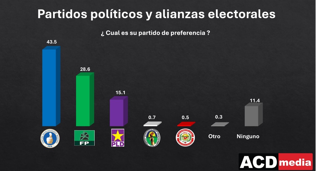 En el tercer lugar está ubicado el Partido de la Liberación Dominicana, con el 15.1 por ciento, de acuerdo a los resultados de la Encuesta de ACD Media.