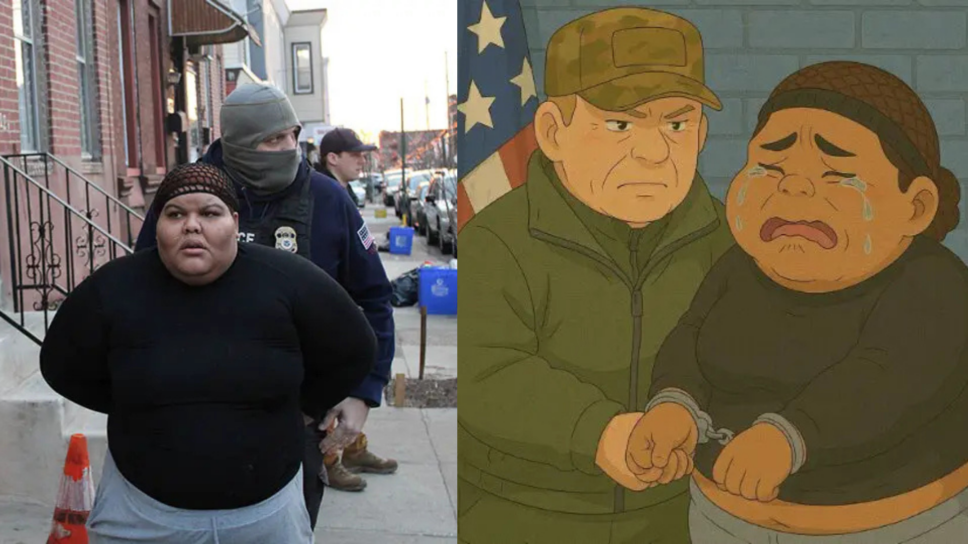 En la caricatura, publicada en la red social X, se ve a una mujer esposada que llora a lágrima viva y viste pantalón de chándal gris, suéter negro ceñido y una rejilla en la cabeza a modo de tocado. Junto a ella, un agente con uniforme verde caqui la observa con semblante serio. De fondo, una bandera estadounidense.